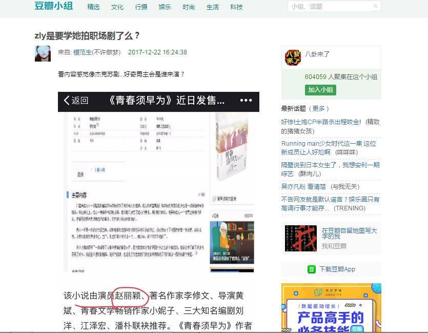 從截圖看,爆料的新餅剛宣影視化,原著小說叫《青春須早為》,而書的封面上確實印有“演員趙麗穎”字樣,其簡介也寫明“該小說由演員趙麗穎、著名作家李修文、導演黃斌、青春文學暢銷作家小妮子、三大知名編劇劉洋、江澤宏、潘樸聯(lián)袂推薦。”。