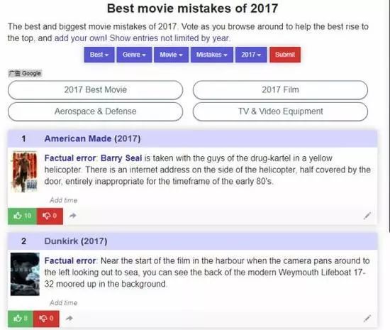 此外,2017年最佳穿幫影片榜(Best movie mistakes of 2017)也同時出爐,“阿湯哥”湯姆·克魯斯主演的電影《美國行動》力壓《敦刻爾克》摘得桂冠。