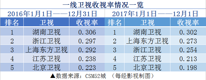 通過對比一線衛(wèi)視近年的收視情況發(fā)現(xiàn),2017年五大衛(wèi)視的收視率較2016年皆出現(xiàn)了不同程度的下滑。有大劇在手,也不一定就能“創(chuàng)收”。