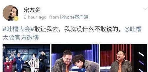 用主持人張紹剛的話說,“以后《吐槽大會(huì)》不需要請(qǐng)這么多人了,想吐誰就吐誰,愛來不來。”節(jié)目錄制后,宋方金還發(fā)微博稱,“敢讓我去,我就沒什么不敢說的。”