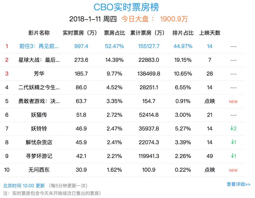截至發稿前,累計票房為15.5億,直奔16億。不僅超越了上映28天的《芳華》,還把同檔期的幾部電影也遠遠甩在后面。據說,這個成績連制作團隊自己也震驚了。貓眼專業版1月10日預測《前任3》總票房將突破19.78億。