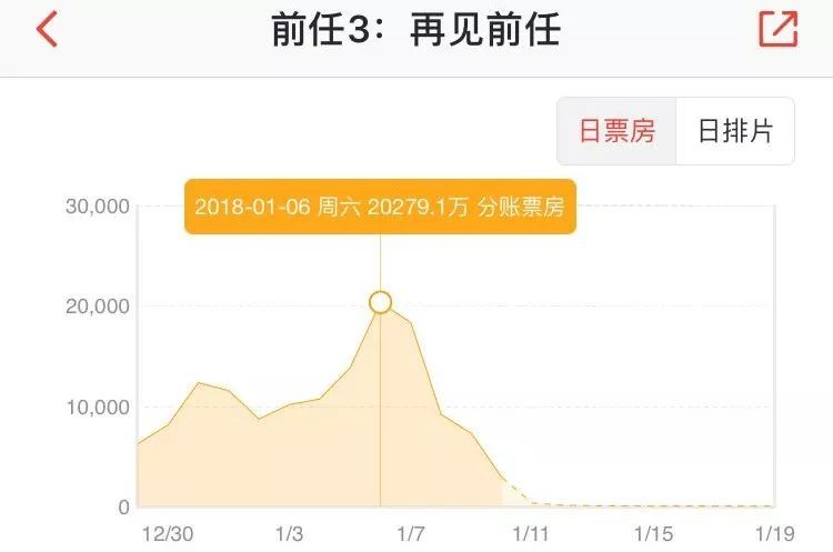 貓眼專業版數據顯示,12月29日《前任3》首映票房并不高,但之后開始出現迷之走向,首周末出現一個“小山包”,第二個周末大反轉,1月6日直沖頂峰,當日即票房超過2億。