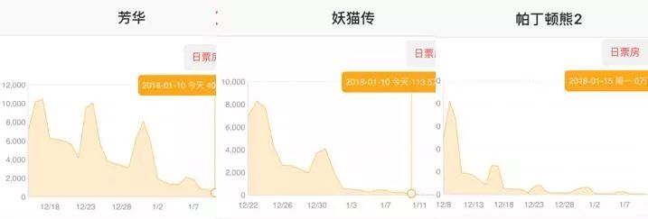 或許要對比其他幾個電影的票房走勢圖,你才知道發了什么↓↓ ,隨機找來最近的《芳華》《妖貓傳》《帕丁頓熊2》等電影的走勢圖,你會發現都有一個共同點:周末票房比工作日高,但總體走勢是由高到低。跟《前任3》確實不是一個路數。