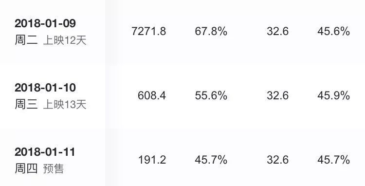 同樣,上座率和排片率也是“低開高走”。首映當天12月29日排片率為18.6%,第二天更是降到16.1%,但后面卻開始一路升高,截至今天(1月10日)已經持續高升至46.1%,足足漲了30%!