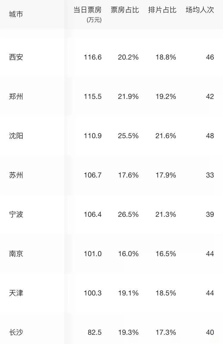 更有意思的是城市票房,首映當天,北京、廣州的場均人次分別為40、41,上海、深圳甚至分別低至32、31。而二線城市的場均人次卻大多在40以上,西安、沈陽甚至高達46、48。