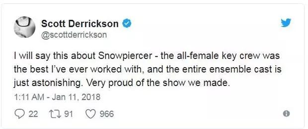斯科特·德瑞克森于1月10日在推特上寫道:“關于《雪國列車》我要說得是,關于雪國列車我想說的是,這幫關鍵角色全是女性成員的團隊是我合作過的最棒的隊伍,整個劇組是驚人的,我為這個項目感到驕傲。“