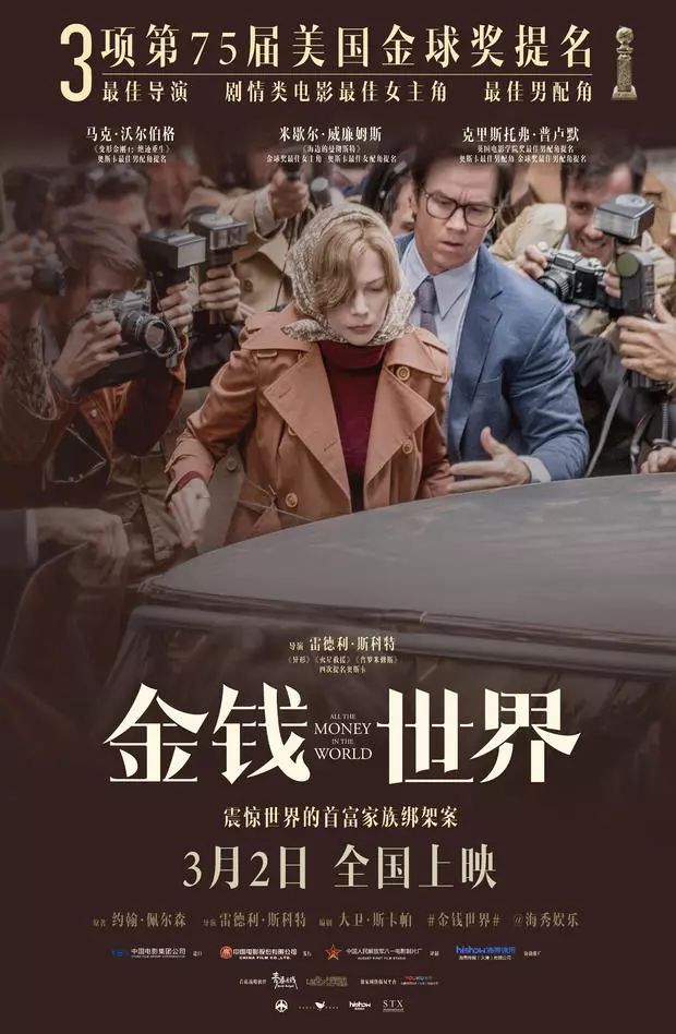 好萊塢傳奇導演雷德利·斯科特新作《金錢世界》宣布引進內地,定檔3月2日全國上映。今日電影發布了定檔預告,揭露更多驚心動魄的綁架案細節。米歇爾·威廉姆斯、克里斯托弗·普盧默、馬克·沃爾伯格三位實力派互飆演技,將這起“最貴綁架案”演繹得驚險刺激、張力十足,盡顯好萊塢大片質感。影片已于圣誕節當天在北美上映,收獲了超高口碑,更有影評人盛贊該片“毫無疑問是今年最好的電影之一”。