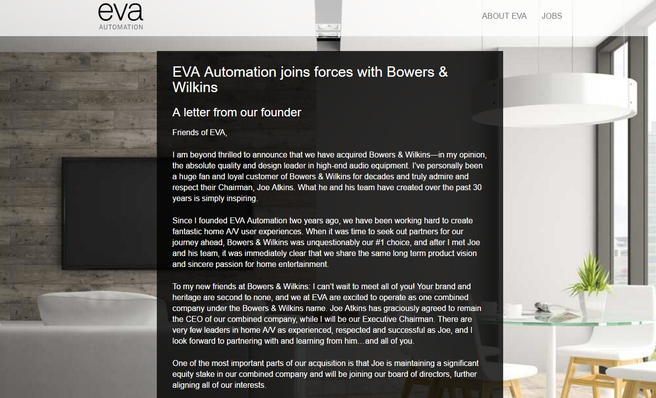 正如標題所說,老牌音響廠商Bowers & Wilkins被收購了,而收購方不是什么大公司,確切來說還只是一個只有40名員工的硅谷初創企業EVA Automation.收購金額似乎并沒有公開,對于EVA Automation這樣名不見經傳的企業吞并像Bowers & Wilkins這樣的業界大佬,還真是罕見的例子.