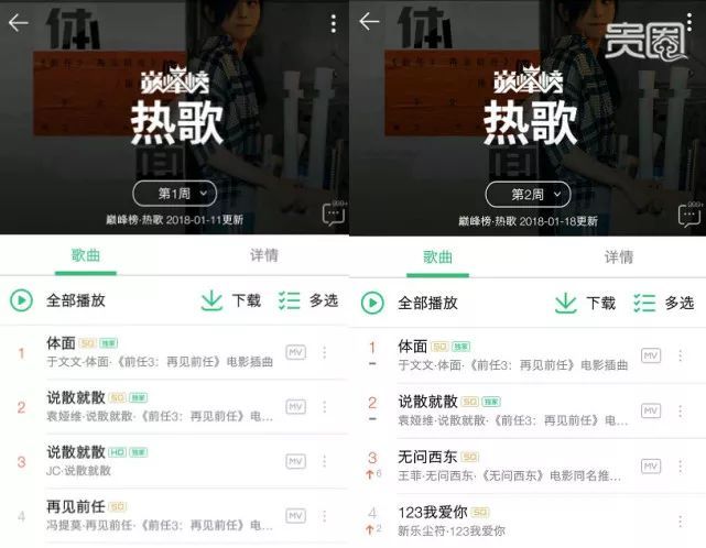 此次《前任3》的宣傳過程中,除了快手、抖音等視頻社交平臺(tái)助力不少,在各類音樂APP上,電影主題曲、插曲《說散就散》、《體面》也長(zhǎng)期占據(jù)各榜單榜首位置?,F(xiàn)在大街小巷,超市、商場(chǎng)、理發(fā)店、網(wǎng)吧……到處都是《體面》和《說散就散》這兩首歌的循環(huán)播放。
