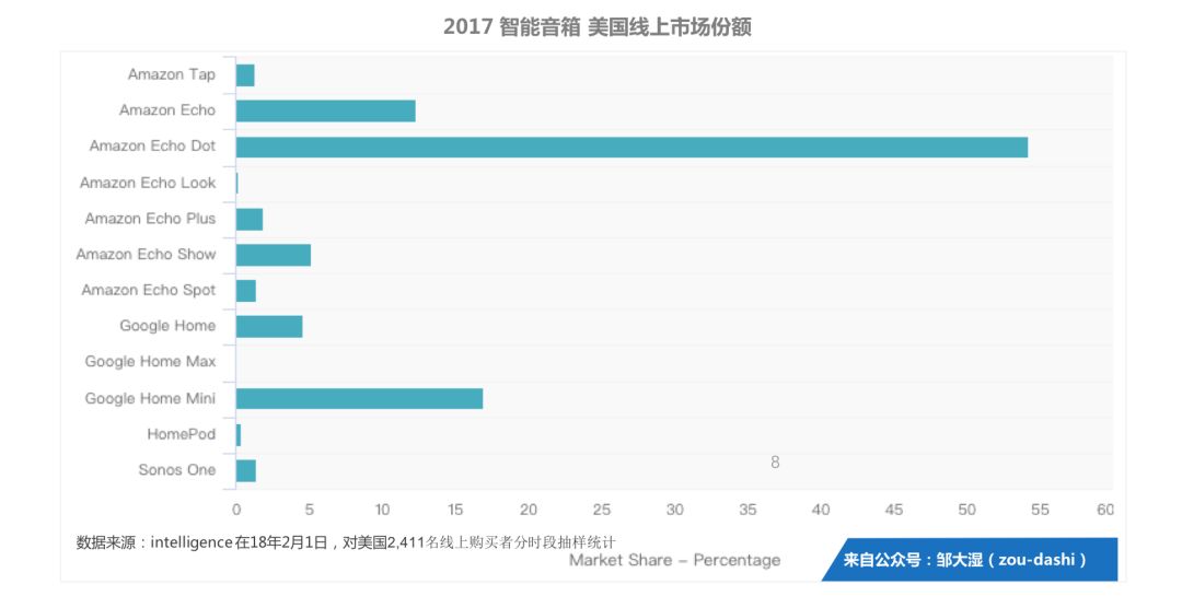 我們在之前文章中,公布了兩組組數據。一個是美國亞馬遜Echo和Google home的的市場份額。第二個是細分品類的份額。之前我們提到了,Echo show在2017年數據很耀眼,是亞馬遜Echo陣營的第三勢力。