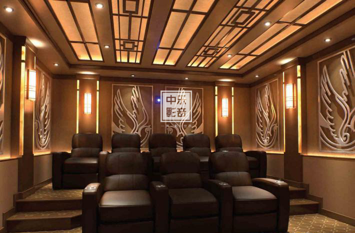 其一:建聲處理:避免過多硬面為主的裝飾物,如大面積的玻璃、石材等,這種裝修對中高頻反射過強,會影響多聲道影院音效的清晰度,可適當增加軟透聲類吸音體,如軟包、布藝沙發等,減少高頻反射聲。如能適當采用漫反射類擴散體和角落低頻陷阱等建聲裝置則效果更好。還有門窗等隔音效果也需考慮在內,以免聲泄漏影響到相鄰包房間的觀影效果。