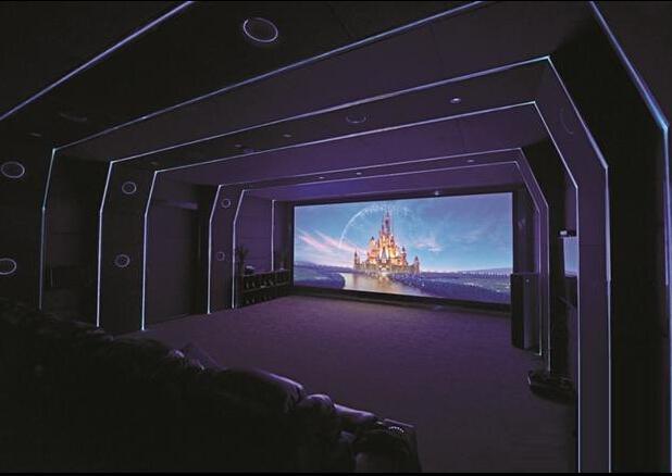 現(xiàn)代家庭影院影音房設(shè)計中,以尋求幕布畫面最大化的基礎(chǔ)上,設(shè)計采用16:9或2.35:1的幕布畫面比例。本方案設(shè)計2.35:1幕布畫面比例。受限于完成面2.9米層高,以及寬闊的前墻寬度,保證幕布尺寸設(shè)計最大化,2.35:1的幕布尺寸比例是本方案最優(yōu)選擇。為避免出現(xiàn)在2.35:1幕布中投放16:9畫面時出現(xiàn)的上下畫面損失情況,中樂影音工程師設(shè)計選用巴可專業(yè)級投影機(jī),此投影機(jī)擁有鏡頭記憶自適應(yīng)功能,針對影片的畫面比例自動調(diào)節(jié)為2.35:或16:9播放比例,避免了畫面損失,完美地保證畫面質(zhì)量。
