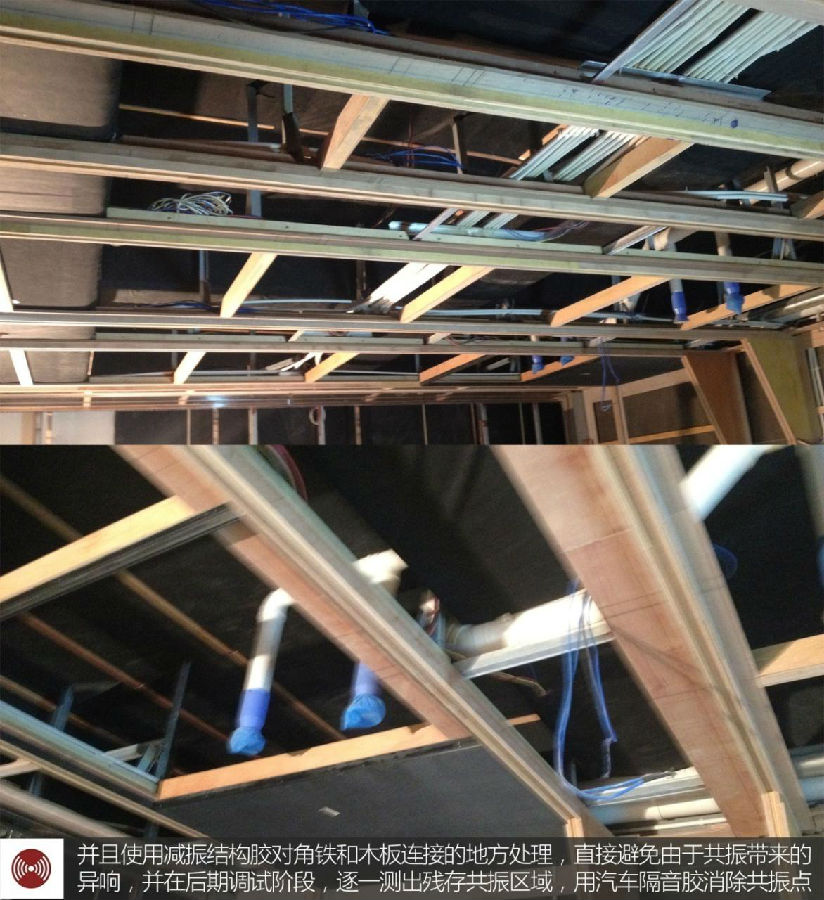 該視聽室采用角鐵焊接的方式制作天花龍骨,為便于在天花安裝吸音裝飾層,在角鐵上釘制木板,并且使用減振結(jié)構(gòu)膠對角鐵和木板連接的地方處理,直接避免由于共振帶來的異響,并在后期調(diào)試階段,逐一測出殘存共振區(qū)域,用汽車隔音膠消除共振點(diǎn)。