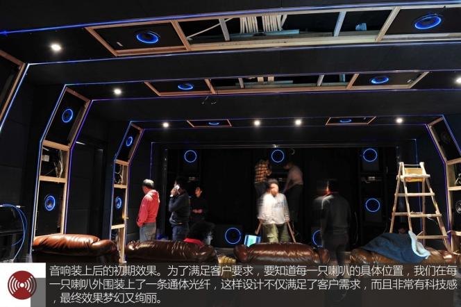 兼顧室內(nèi)尺寸與層高,綜合考慮視聽室電子設(shè)備擺放與空間闊大的設(shè)計感,設(shè)計工程師將所有設(shè)備隔離到座位后方的一個獨(dú)立空間里面,采取層進(jìn)式空間設(shè)計方式,保證簡潔空間外觀又兼顧空間設(shè)計美感。傳統(tǒng)影院設(shè)計中,以黑灰色色調(diào)為主,觀影者長時間在密閉空間內(nèi),會產(chǎn)生壓抑感。面對這一問題,中樂影音工程師考慮到業(yè)主日常使用的需求,又需兼顧燈光效果的“搶眼性”與避免燈光亮度的“刺眼性”,綜合考慮使用同軸喇叭等要素,有針對性設(shè)計與同軸喇叭形狀相一致的圓形渲染化燈光,藍(lán)色燈帶與藍(lán)色音箱光圈舒緩了觀影者的壓抑感,更營造出現(xiàn)代科技美感。